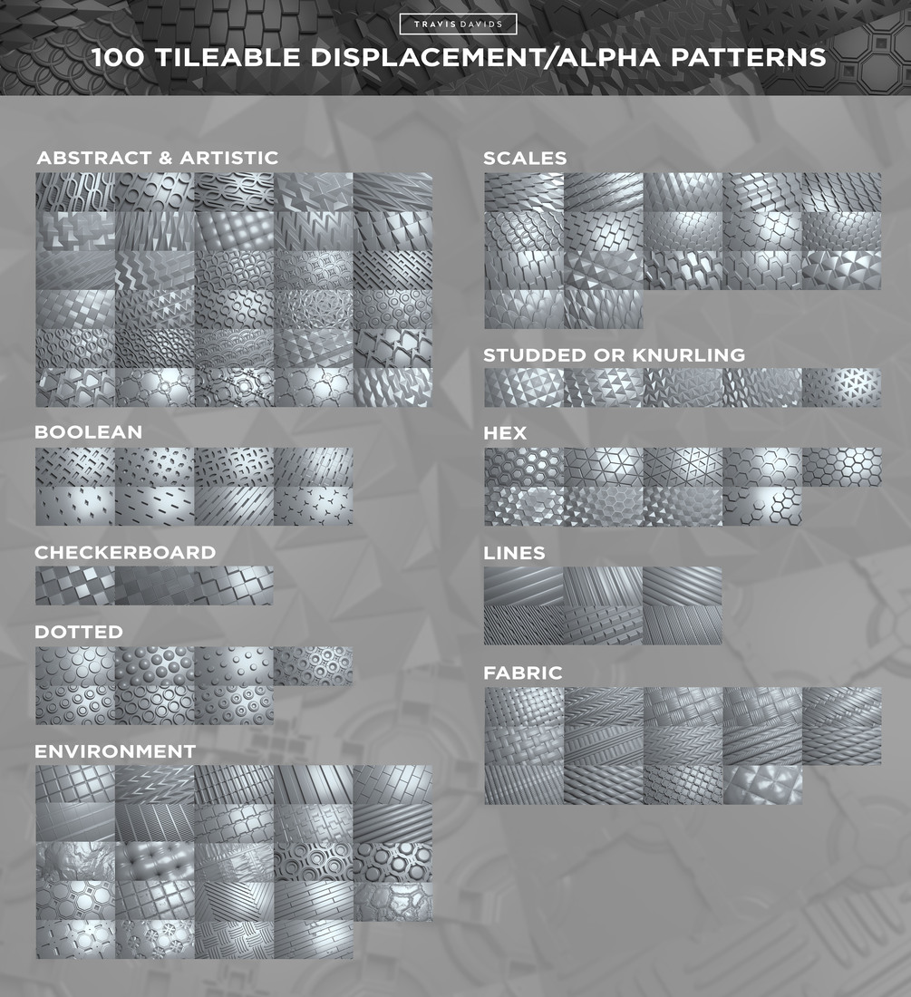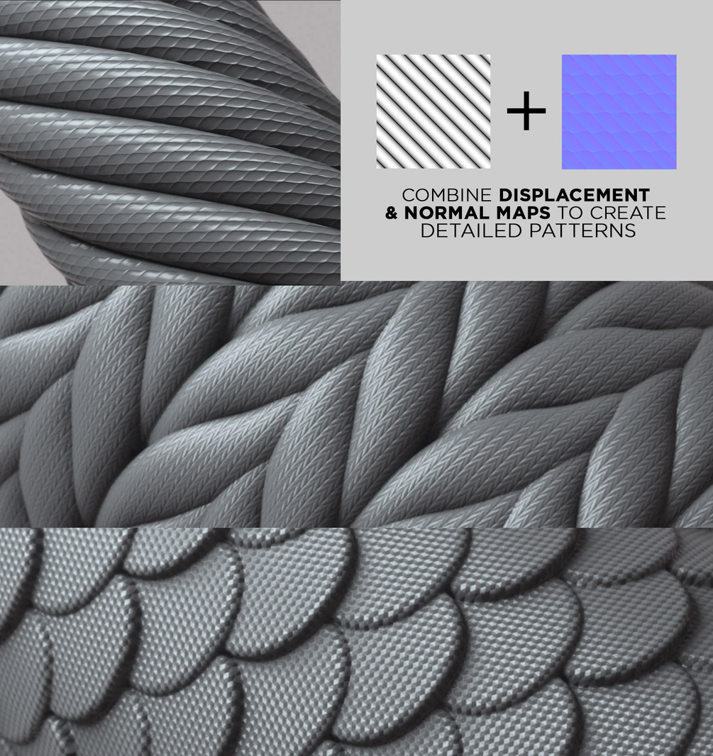 These displacement patterns are useful for quickly detailing simple geometry or adding more complex surface detail to your 3D models.