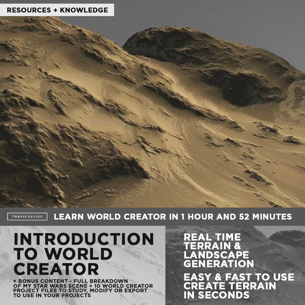 I've included a full introduction to World Creator detailing all of the useful tools and features that I use in my workflow. I cover everything in real time from start to finish. At the end you will learn how to create terrain and landscapes effortlessly with so much variation, control and speed. You'll also learn how to texture terrain, export it and use it with any 3D program.